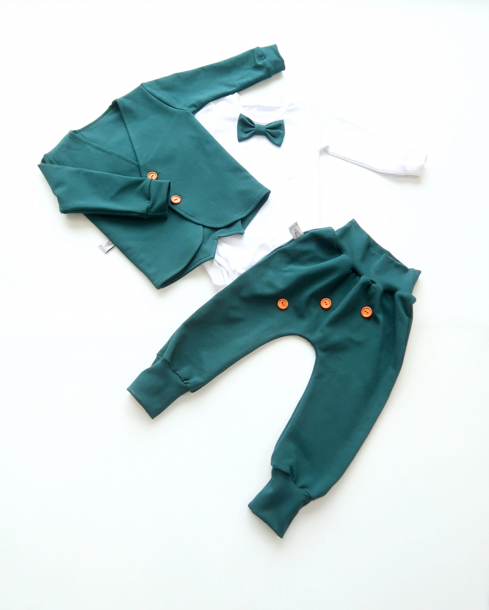 Komplet zieleń butelkowa z guziczkami - bezuciskowe baggy i body z muchą