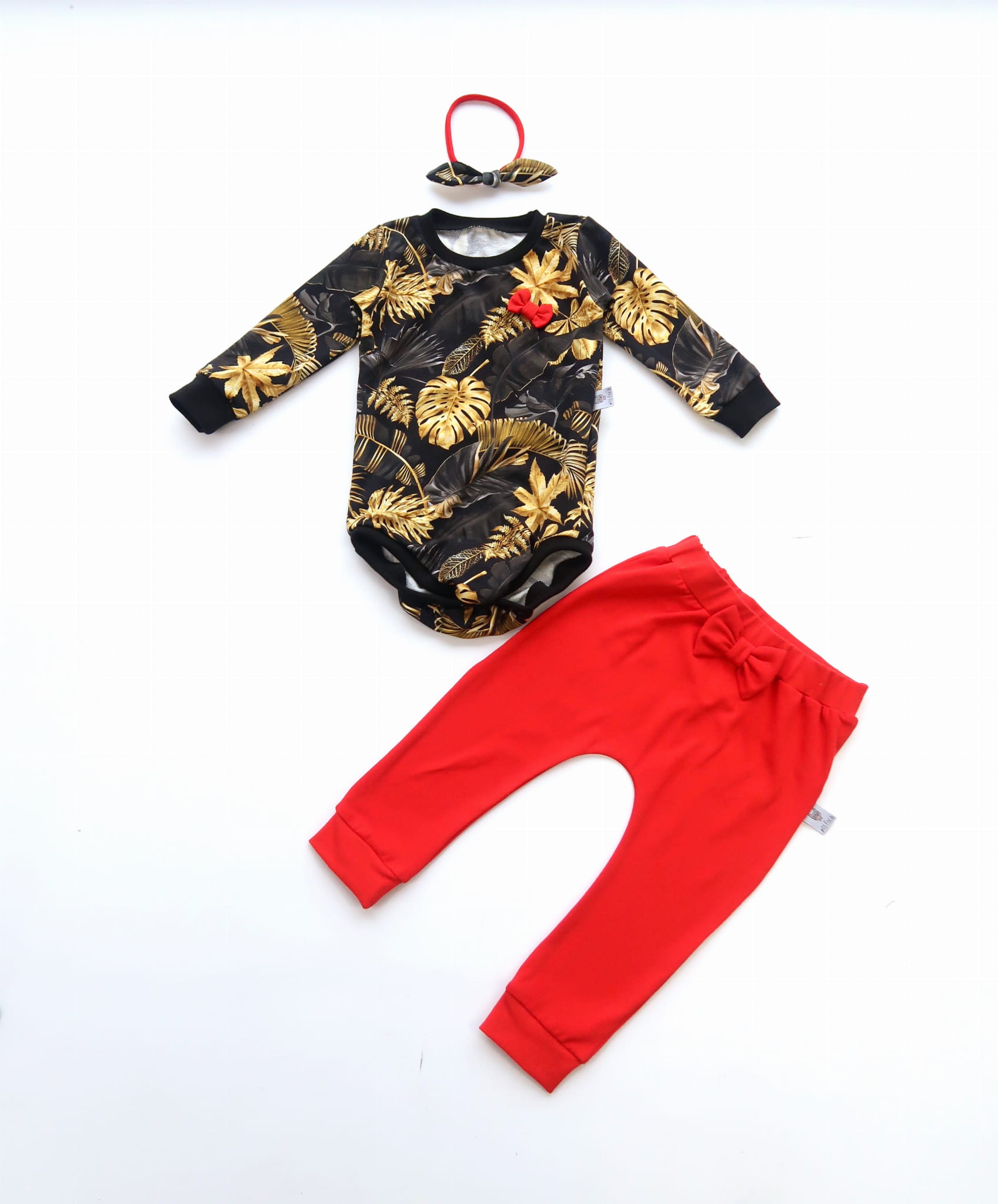 Komplet złote liście i czerwień - body, legginsy i opaska bezuciskowa