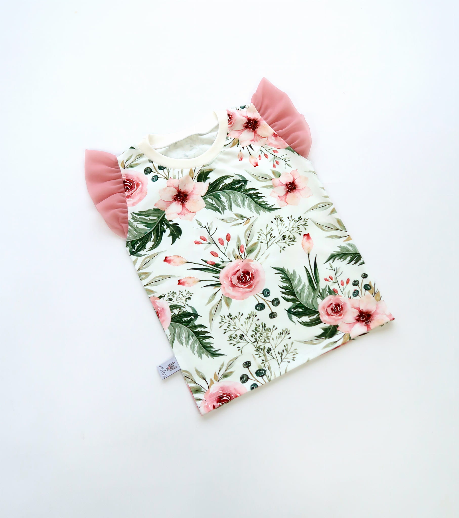Komplet kwiaty w ogrodzie i kwarc - koszulka i bloomersy z falbankami