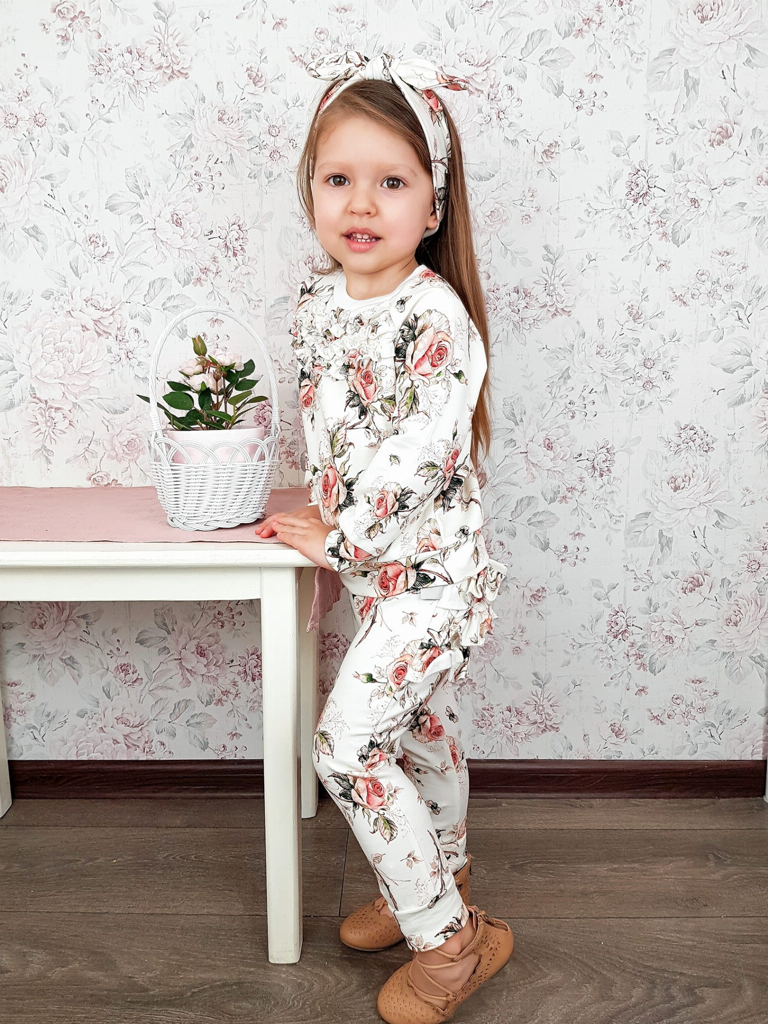 Komplet ecru i róże retro - body, legginsy z falbankami i opaska