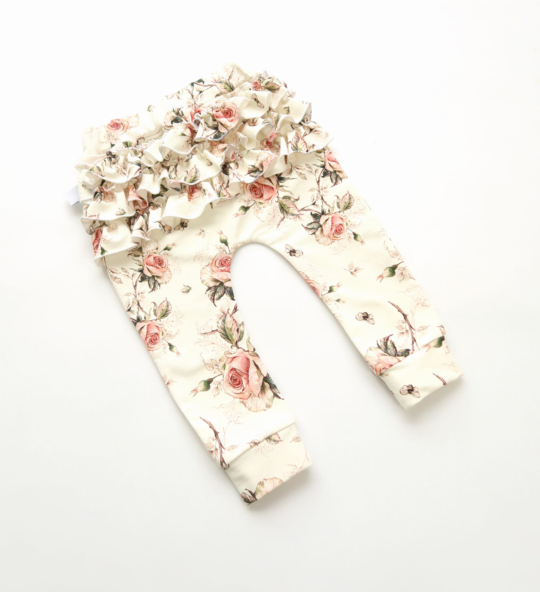Komplet ecru i róże retro - body z bufkami i legginsy z falbankami