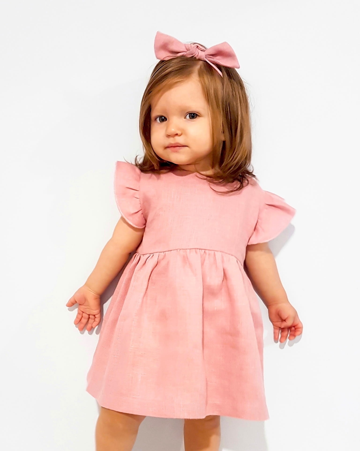 Komplet - lniana sukienka róż kwarcowy i opaska bezuciskowa r 68