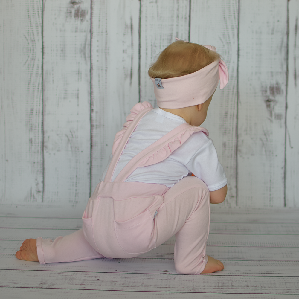 Komplet stal i róż pudrowy z falbankami - body, legginsy i opaska