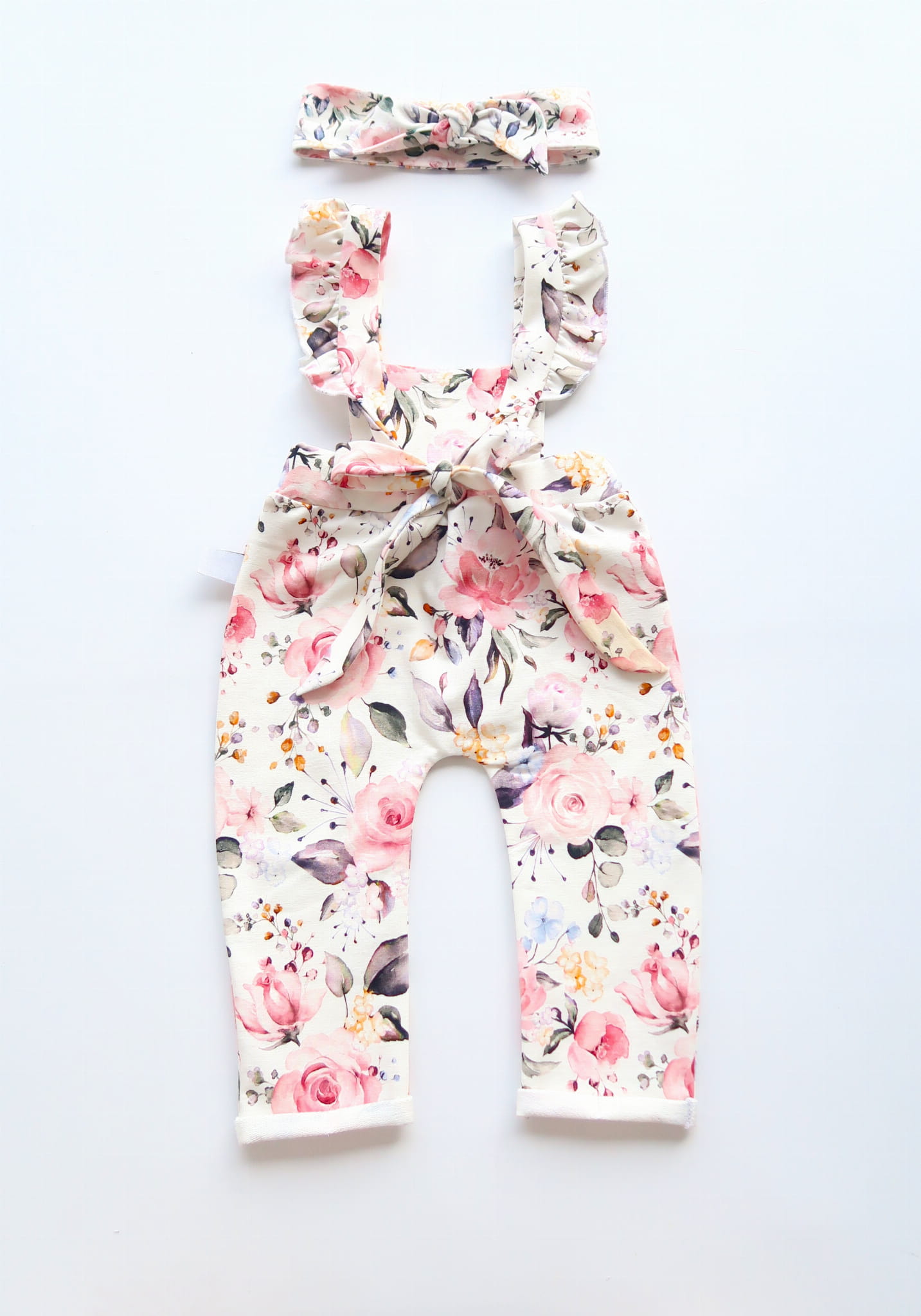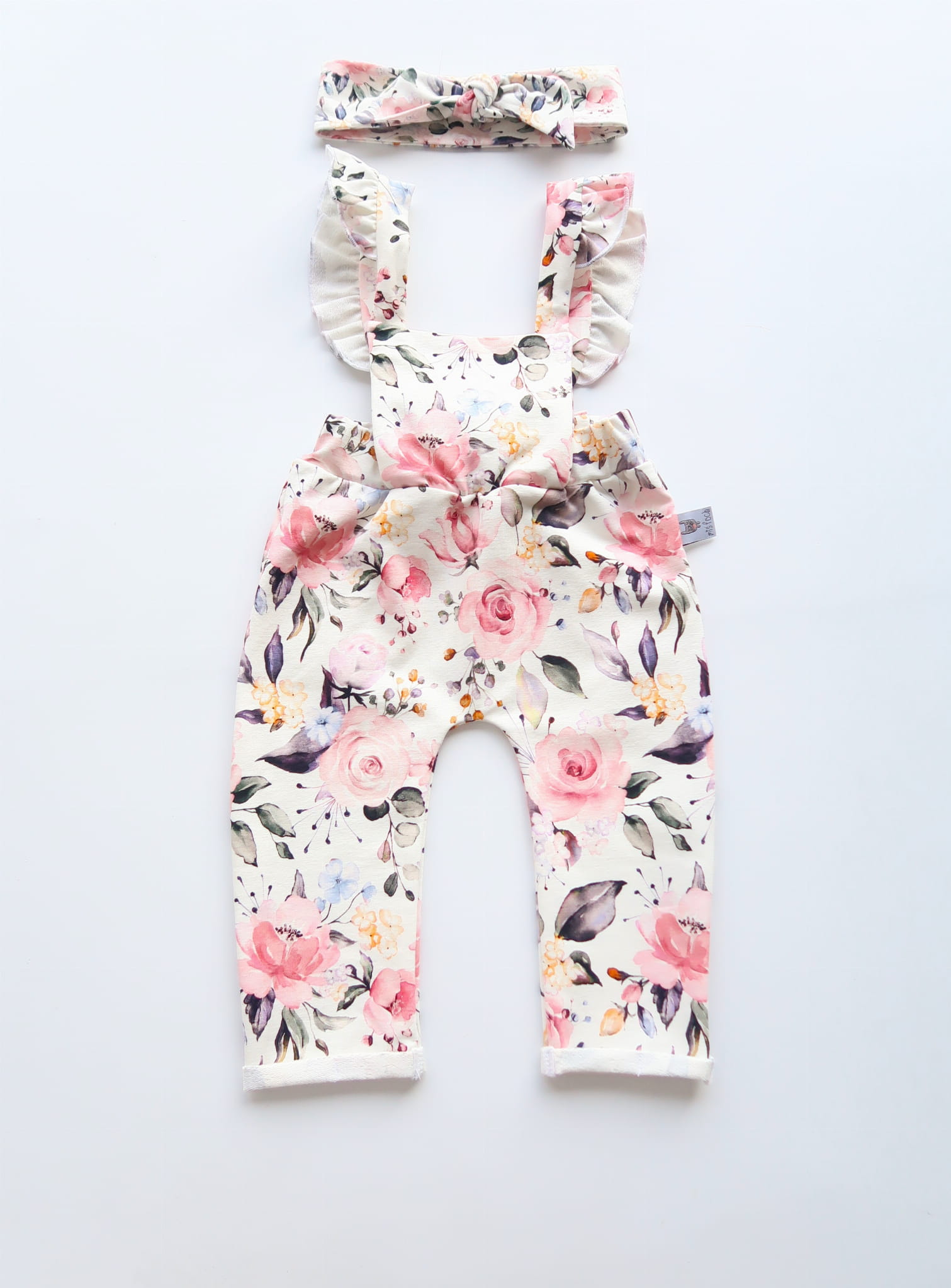 Komplet różany ogród i ecru - bezuciskowe baggy z falbanką, body i opaska