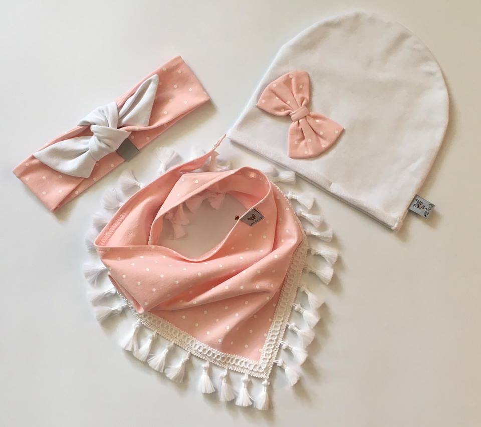 Komplet kropeczki i biel - czapka, chusta i opaska