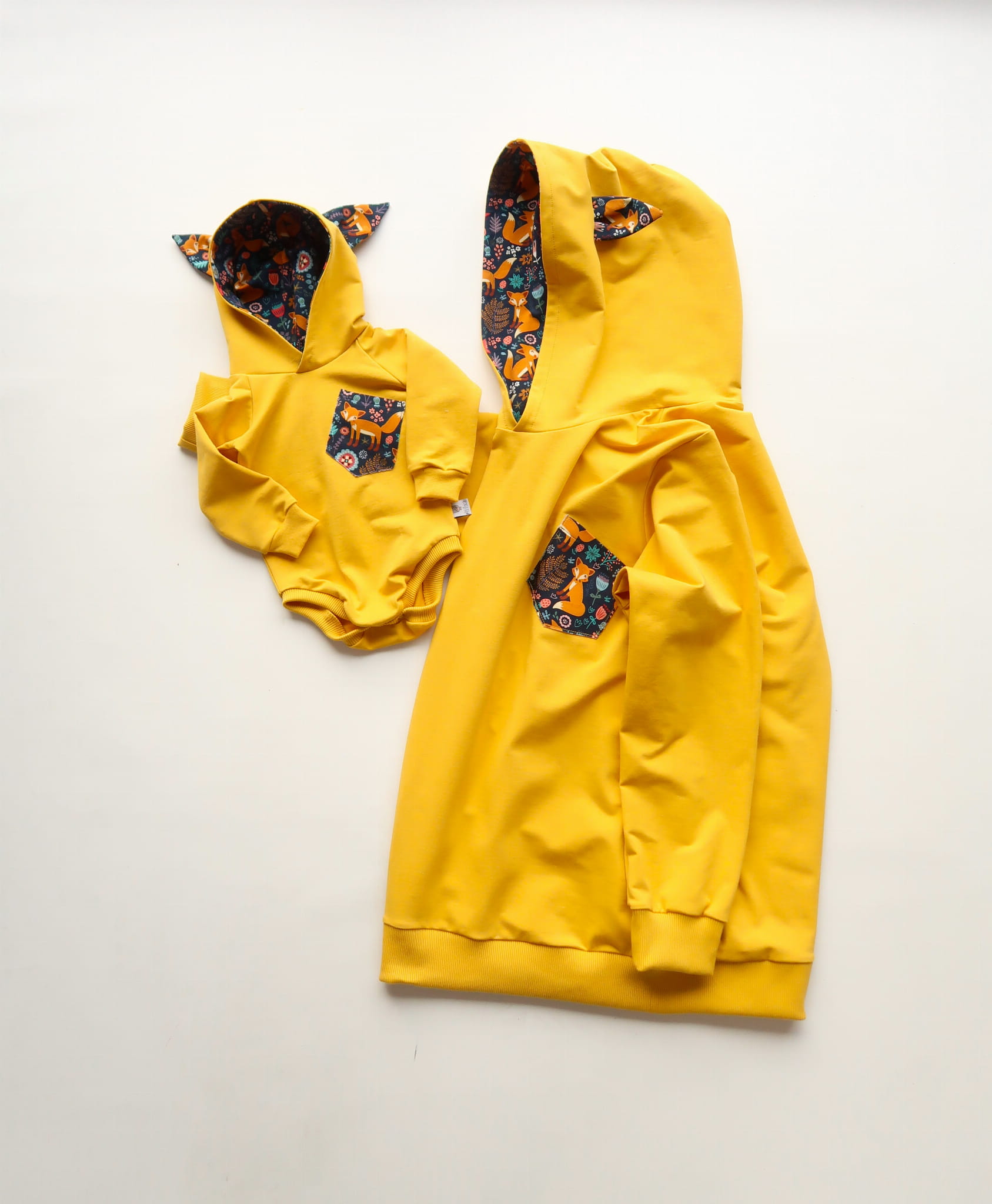 Miękkie i wygodne ubrania - dla taty bluza a dla szkraba body z kapturem. Uszyte z dbałością o najmniejszy szczegół, z najwyższej jakości dresówki, wykończone ściągaczami.