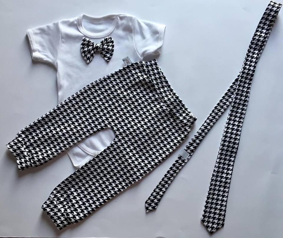 W skład kompletu wchodzą: krawat dla taty oraz baggy i body z muchą dla Szkraba.