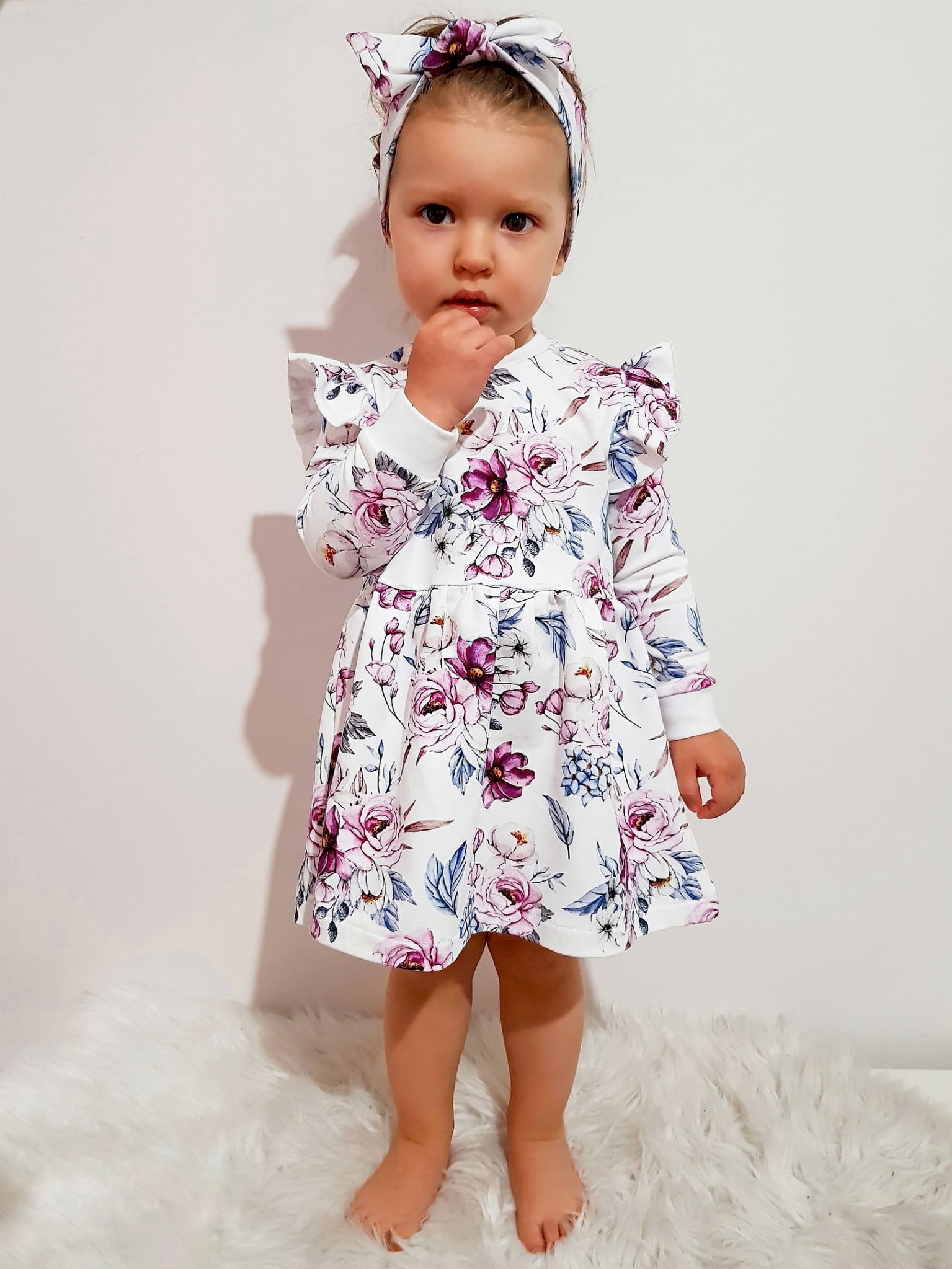 Komplet akwarelowe kwiaty - sukienka krótki rękaw z motylkiem i opaska