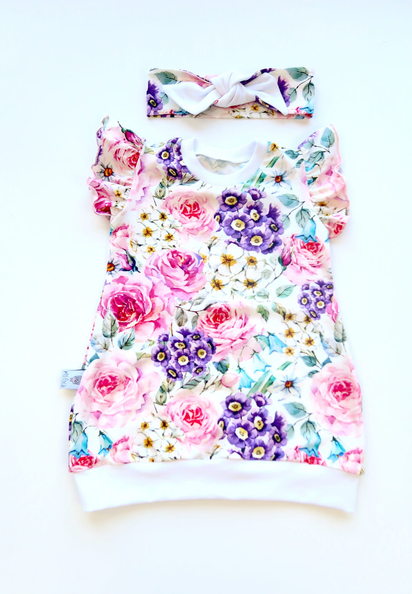 Komplet letnie kwiaty - body, spódniczka i opaska